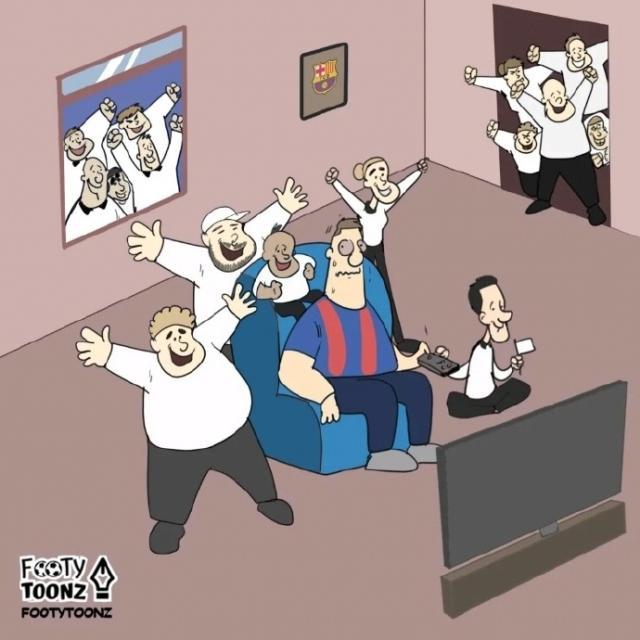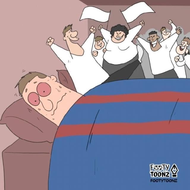 也有自媒体在社媒上发表漫画,讽刺巴萨主场成了法兰克福球迷的庆祝现场。画中一名巴萨球迷坐在家中的椅子上,身边被穿白色球衣的法兰克福球迷包围,而当他睡到自己床上,旁边还是法兰克福的球迷在庆祝。